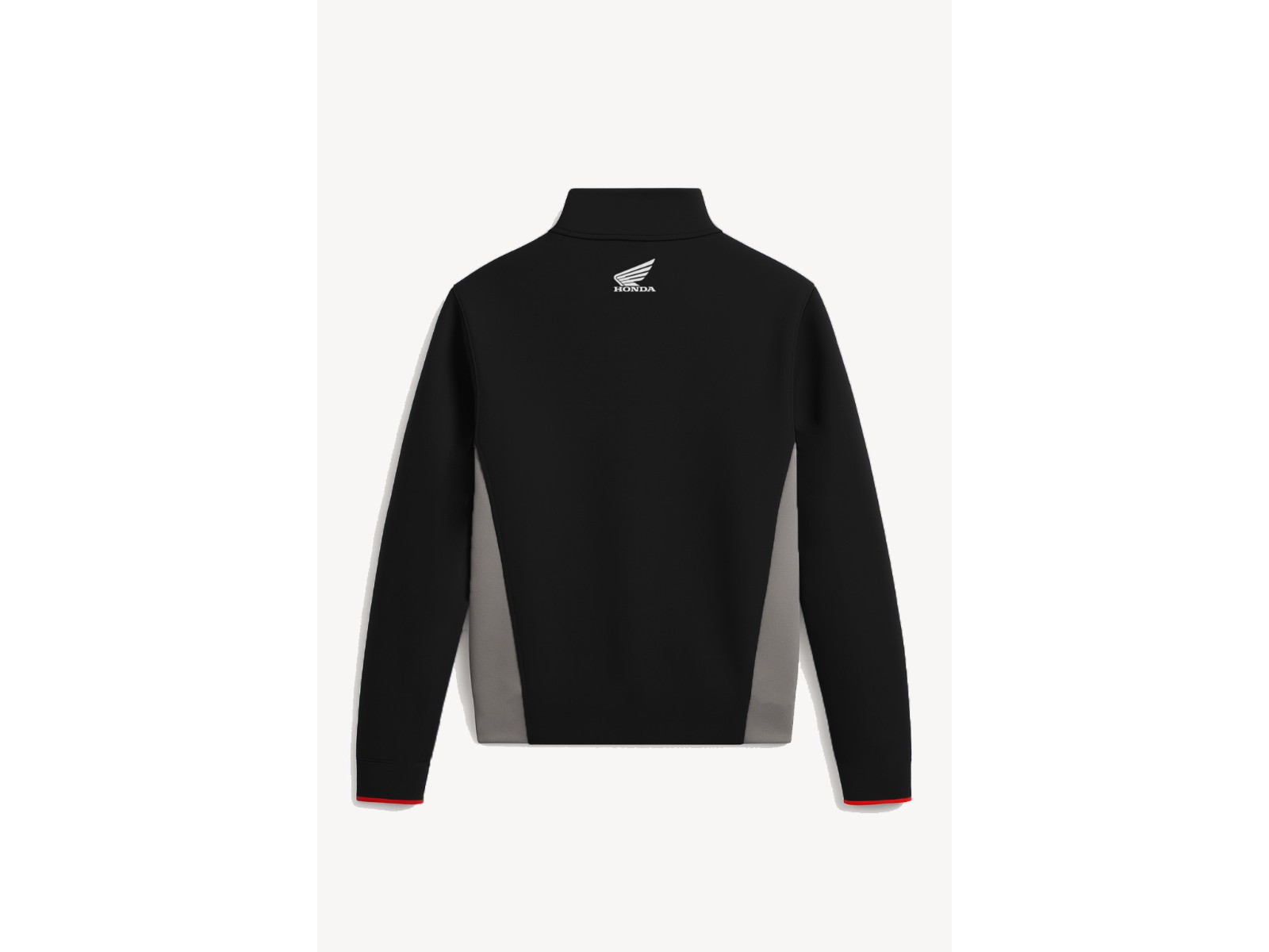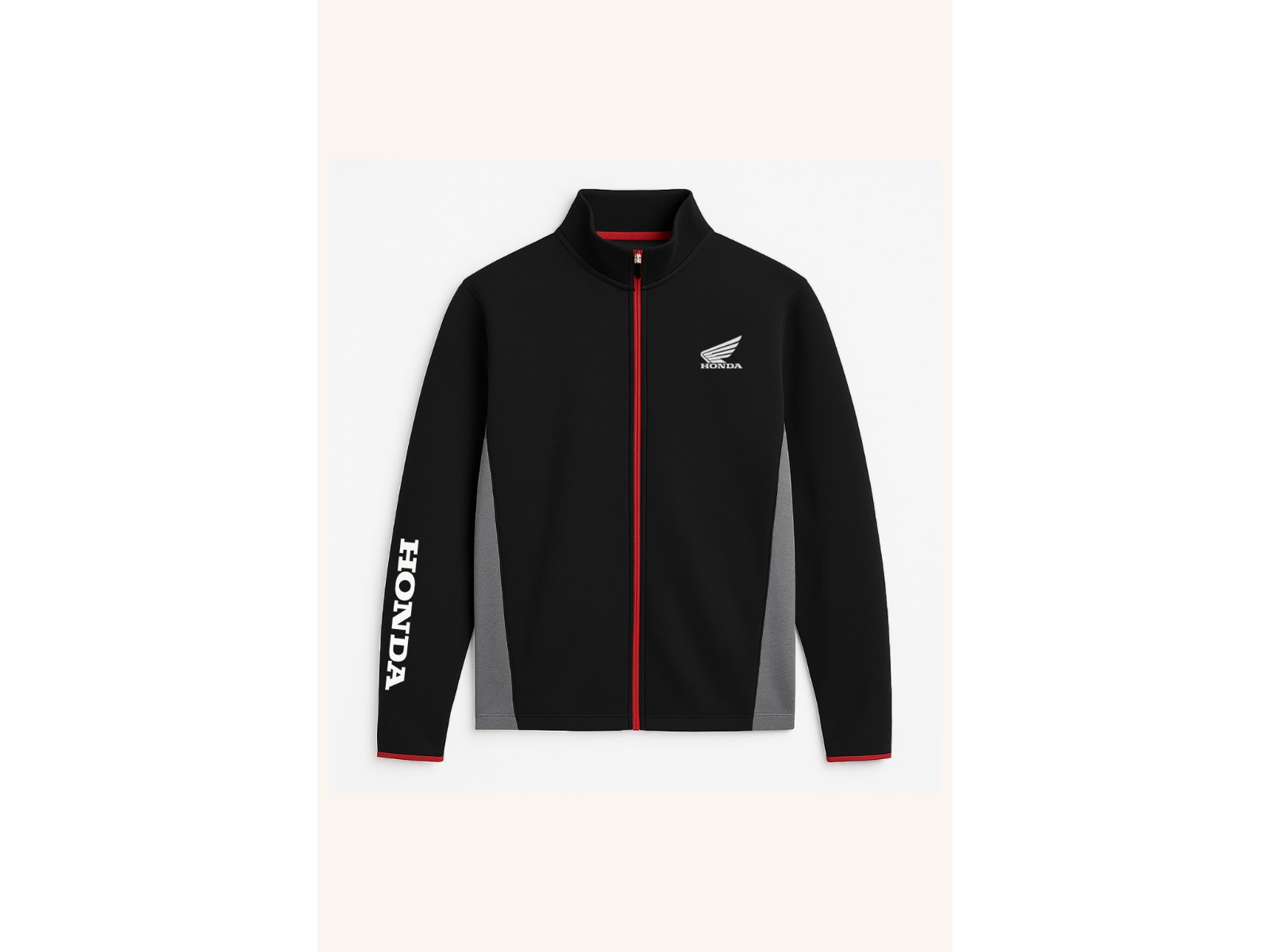 Die Honda Wing Fleece-Jacke vereint hochwertige Materialien mit dynamischem Racing-Style – perfekt für alle, die Performance und Lässigkeit leben. Gefertigt aus weichem Baumwoll-Interlock bietet sie eine strukturierte, zugleich angenehme Haptik, die dich jederzeit komfortabel begleitet. Das markante Schwarz mit grauen Seiteneinsätzen und dem kontrastierenden roten Reißverschluss setzt sportliche Akzente, während rote Details entlang des Zippers dem Look zusätzliche Energie verleihen. Das ikonische Honda Wing-Logo auf der Brust und der markante Honda-Schriftzug am Ärmel verleihen der Jacke unverwechselbaren Spirit und authentische Motorsport-DNA.